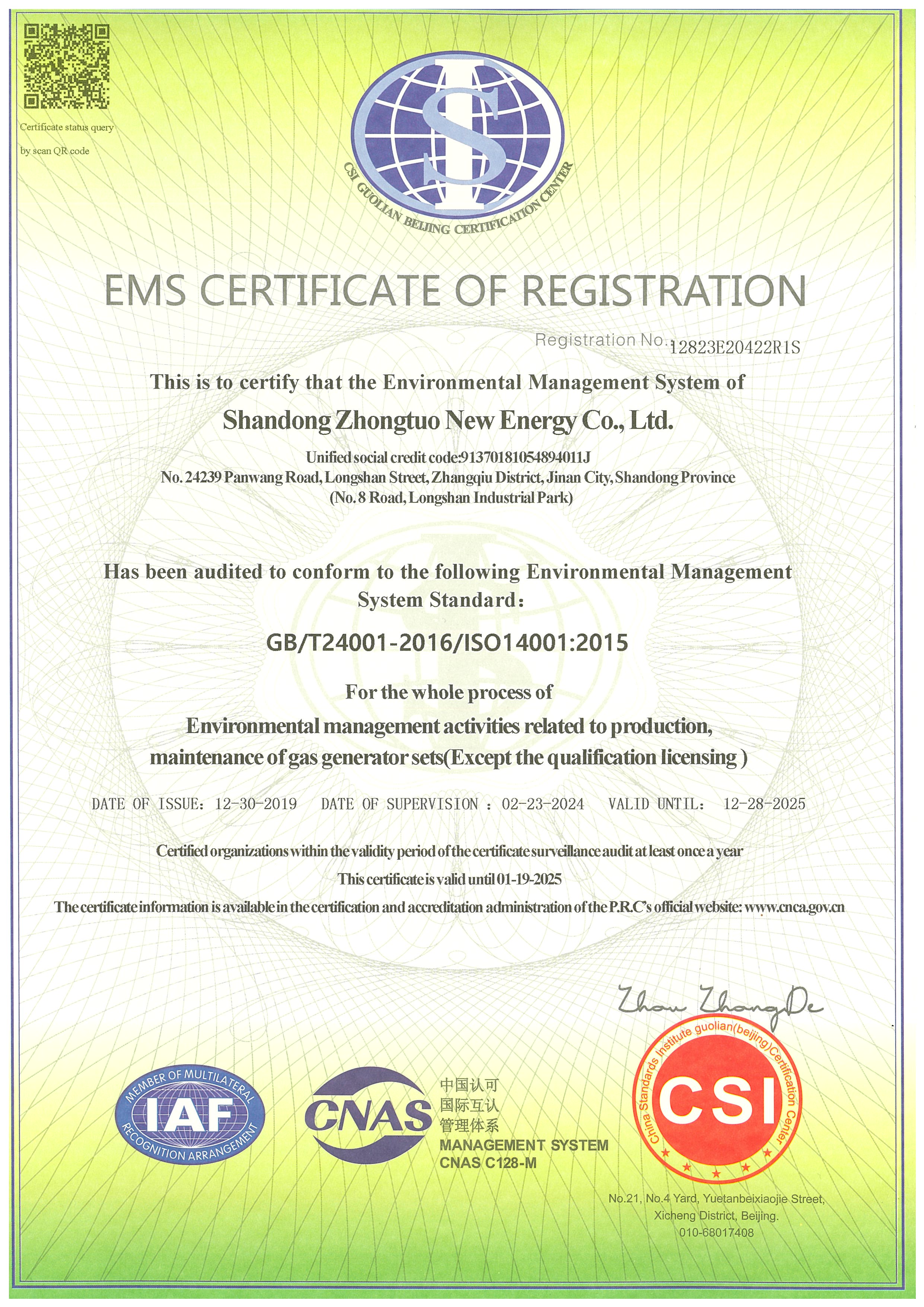 環(huán)境管理體系認(rèn)證證書